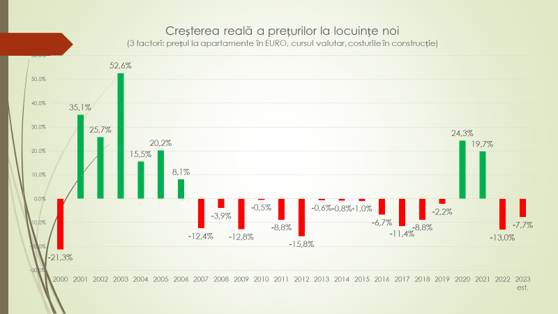 Evoluția prețurilor la apartamentele pe piața secundară. Analistul economic susține că în perioada 2008-2010, prețul apartamentelor vechi era mai mare decât al apartamentelor noi. După 2011, a fost înregistrată o scădere a prețurilor la cele vechi. Apartamentele noi aveau creșteri de preț mai rapide, iar cele vechi – mai încetinite. Apartamentele vechi, până în 2018, au înregistrat o scădere continuă de prețuri, dar mai slabă față de a celor noi. Prețul apartamentelor noi a crescut cu 25%, iar al celor vechi cu maximul 16%. În 2022, piața secundară a fost mai stabilă din punct de vedere al creșterii prețurilor și al ritmului de creștere. Până în trimestrul II din 2023 a fost tendința de scădere a prețurilor. Din trimestrul III, la apartamentele noi se simte înviorare, iar la cele vechi – stagnare, cu mici semne de înviorare.
