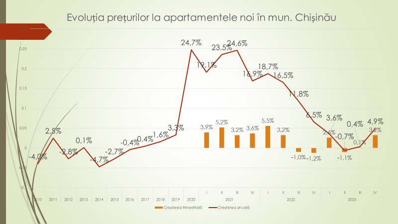 Evoluția prețurilor la apartamentele noi în municipiul Chișinău. Veaceslav Ioniță susține că în 2010 au scăzut cu 4%, în 2011 au crescut cu 2,5%. Au scăzut din nou, cu 2,8%, în 2012, apoi a urmat o creștere de 0,1% în 2013, scăzând din nou, cu 4,7%, în 2014, cu 2,7% în 2015 și cu 0,4% în 2015. Ulterior au urmat creșteri, ajungând la 24,7% în 2020. A fost creștere și în 2021, dar nu atât de esențială ca în 2020. În 2021, 2022 și până în trimestrul II din 2023 piața s-a dus în jos. Din trimestrul III 2023, se înregistrează o ușoară înviorare. În trimestrul IV din 2023, prețurile la apartamentele noi au crescut cu 4,9%.