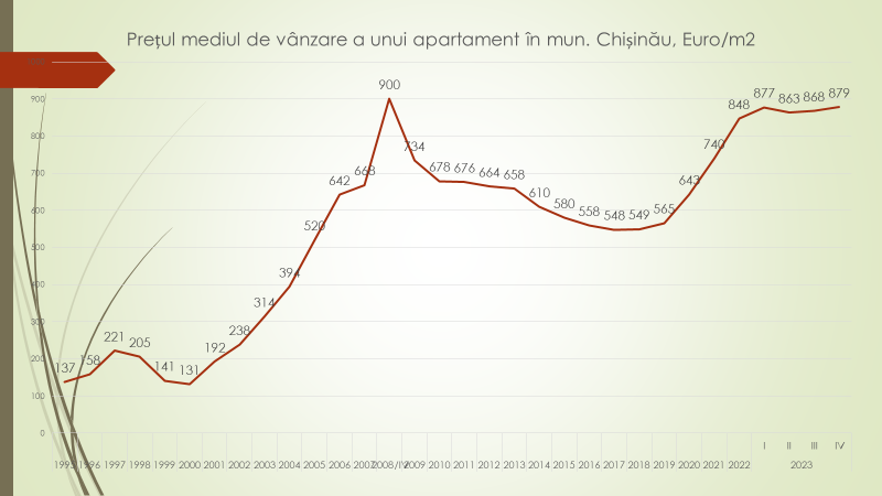 Prețul mediu de vânzare a unui apartament în municipiul Chișinău. Economistul afirmă că în 1999, un metru pătrat de spațiu locativ în municipiul Chișinău costa 137 de euro. În 2000 a coborât la 131 de euro. În 2005 a crescut la 520 de euro. În 2008 a ajuns la 900 de euro, iar în 2009 a coborât la 734 de euro. Scăderea a continuat până în 2017, ajungând la 548 de euro. Din 2018 a avut un trend de creștere, ajungând la 877 de euro în trimestrul I din 2023. În trimestrele II și III din 2023, prețul mediu de vânzare al unui metru păstrat a constituit 863 și 868 de euro. În trimestrul IV a crescut la 879 de euro.