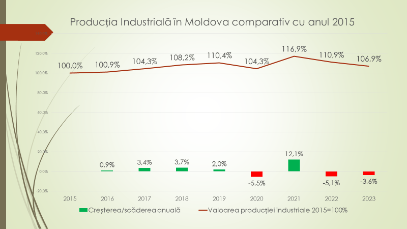 Potrivit expertului, în 2016, creșterea producției industriale în Republica Moldova a fost de 0,9%, iar în 2023 a ajuns la 6,9%. În acești șapte ani, mai mult de 6,9% a fost în 2018 (+8,2%), 2019 (+10,4%), 2021 (+16,9%) și 2022 (+10,9%). În 2023 a fost la nivelul anilor 2017-2018. „În Republica Moldova, din 2015 a crescut foarte timid producția industrială. În special, în ultimii patru ani avem o situație neplăcută. Trei ani a fost în scădere producția industrială și doar un singur an, 2021, a fost an de recuperare, +16,9%. Industria noastră pur și simplu supravețuiește”, a spus expertul.