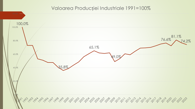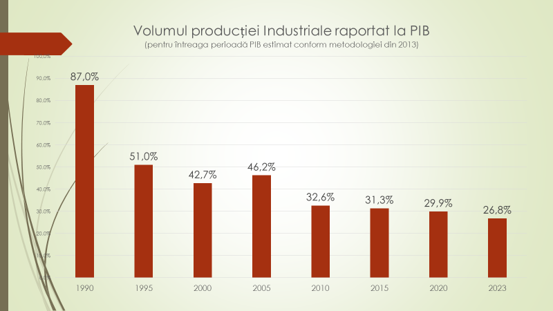 Analistul economic afirmă că raportat la Produsul Intern Brut (PIB), volumul producției industriale în 1990 era de 87%. În 2000 a ajuns la 42,7%. Către 2005 a crescut la 46,2%, dar a scăzut la 32,6% în 2010; la 31,5% în 2015; la 29,9% în 2020 și la 26,8% în 2023.