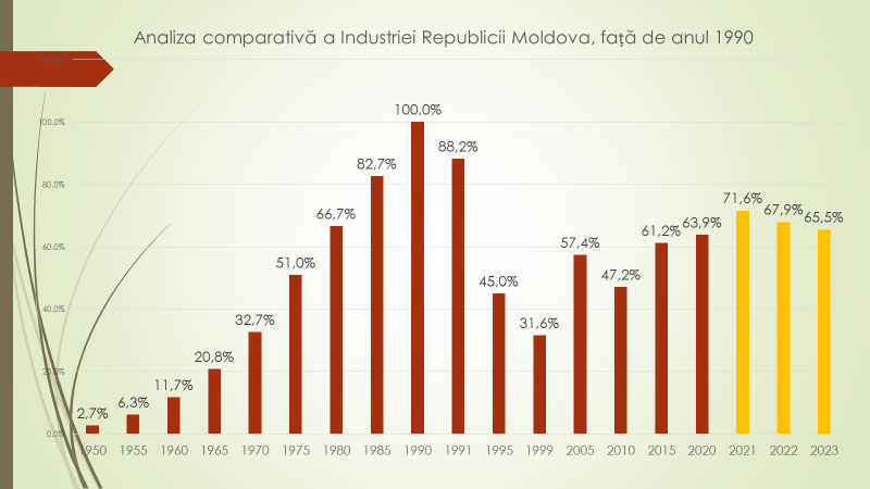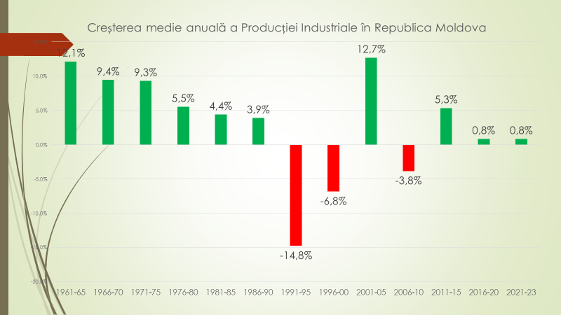 Potrivit economistului, creșterea medie anuală a producției industriale în Republica Moldova, în perioada anilor 1960-1965, a fost de 21,1%. Între 1971-1975 de 9,3%; 1981-1985 de 4,4%. Între 1991 și 1995 a scăzut cu 14,8% și cu 6,8% între 1996 și 2000. Între 2001 și 2005 a crescut cu 12,7%. Din 2006 și până în 2010 a scăzut cu 3,8%. Din 2011 și până în 2015 a crescut cu 5,3%; 2016-2020 cu 0,8%. Anual, din 2021 și până în 2023 tot +0,8%. „Ritmul de creștere este încet. Cu acest ritm, să ajungem acolo unde am fost în 1990 ne mai trebuie încă 15-20 de ani”, a declarat economistul.