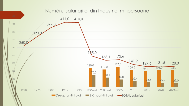 Referitor la numărul salariaților din industrie, Veaceslav Ioniță a menționat că, pe ambele maluri ale Nistrului, în 1970 erau 210 mii de oameni. În 1990 lucrau deja 410 mii. 60% lucrau pe malul drept, alții 40% peste Nistru. Către 1995 a scăzut numărul celor antrenați în industrie la 195 de mii. Către 2000 la 168,1 mii, iar către 2005 a crescut la 172,6 mii. Către 2010 a scăzut la 141,9 mii; către 2020 a ajuns la 131,5 mii; 2023 – 128 de mii de persoane. Scăderea a fost mai pronunțată pentru malul stâng al Nistrului. Numărul celor ocupați în industrie a scăzut de la 75 de mii de oameni în 1990 la 23 de mii în 2023.