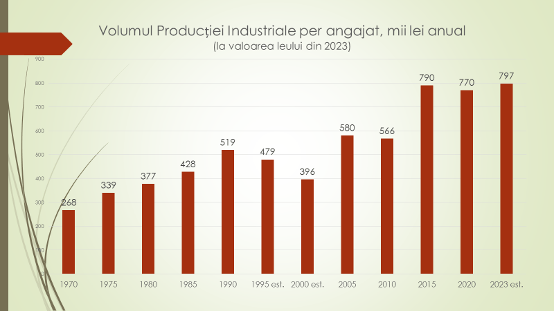 Vorbind despre volumul producției industriale per angajat, expertul a specificat că în 1970 un angajat din industrie producea marfă de 268 de mii de lei la valoarea leului de astăzi. În 1990 de 519 mii de lei. A scăzut la 396 de mii de lei în 2000. A crescut, din nou, la 797 de mii în 2023. „Chiar dacă avem o scădere a producției industriale, dar dacă a scăzut numărul de salariați, a crescut productivitatea muncii. În 30 de ani să ai o modestă creștere a productivității muncii este cam trist”, a opinat expertul.