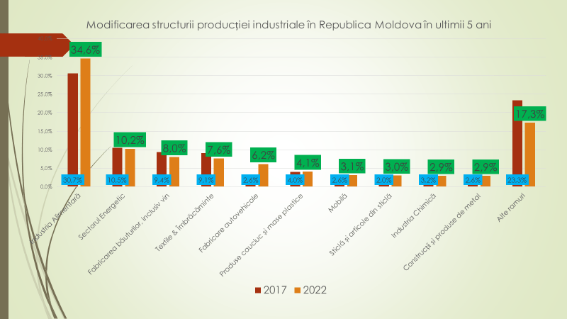 Potrivit economistului, cea mai mare pondere a industriei este reprezentat de sectorul alimentar. În 2017 domeniul alimentar reprezenta în industria țării 30,7%, iar în 2022 – 34,6%. Sectorul energetic reprezenta 10,5% în 2017 a scăzut la 10,2% în 2022. Fabricarea băuturilor deținea o pondere de 9,4% în 2017, iar în 2022 a scăzut la 8%. Textile și îmbrăcăminte a scăzut de la 9,1% în 2017 la 7,6% în 2022. Fabricare autovehicule: 2,6% în 2017 – 6,2% în 2022. Produse din cauciuc și mase plastice: 4% în 2017 – 4,1% în 2022. Mobilă: 2,6% în 2017 – 3,1% în 2022. Sticlă și articole din sticlă: 2% în 2017 – 3% în 2022. Industria chimică: 3,2% în 2017 – 2,9% în 2022. Construcții și produse din metal: 2,6% în 2017 – 2,9% în 2022.