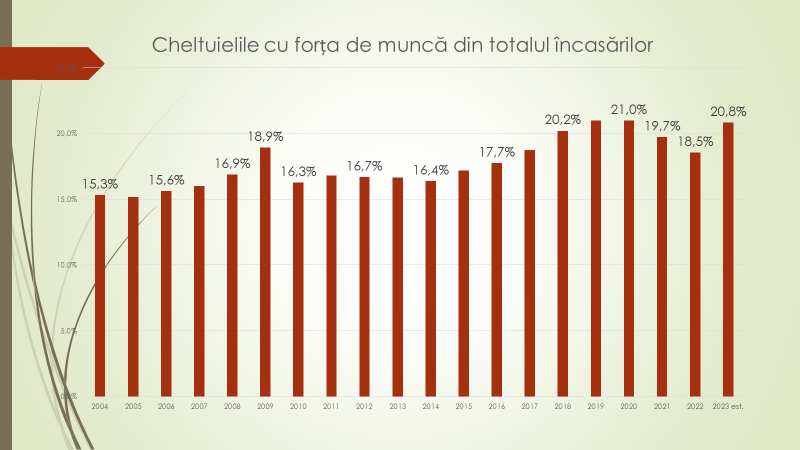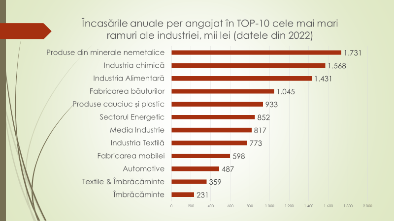 Analistul economic a mai menționat că un angajat al sectorului de produse din minerale nemetalice livrează anual producție de 1,7 milioane de lei. Cel din industria chimică – 1,5 milioane de lei anual; din industria alimentară – 1,4 milioane de lei anual, fabricarea băuturilor – puțin peste 1 milion de lei anual; produse din cauciuc și plastic – 993 de mii de lei; sectorul energetic – 852 de mii de lei; industria textilă – 773 de mii de lei; fabricarea mobilei – 598 de mii de lei; automotive – 487 de mii de lei; textile și îmbrăcăminte – 359 de mii de lei; îmbrăcăminte – 231 de mii de lei anual. Despre cheltuielile privind forța de muncă din totalul încasărilor, a menționat că în 2004 erau de 15,3%. În 2009 a ajuns 18,9%; 2020 – 21%. În 2023 – a scăzut la 20,8%.