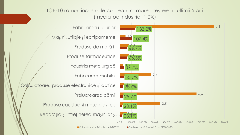 Expertul a făcut și un top zece ramuri industriale cu cea mai mare creștere în ultimii cinci ani. Este vorba de fabricarea uleiului, care are un volum al producției de 8,1 miliarde de lei și a crescut în ultimii cinci ani cu 133,2%. Mașini, utilaje și echipamente, cu un volum al producției de 500 de milioane de lei și a avut în ultimii cinci ani o creștere de 107,4%. Produse de morărit au un volum al producției de 800 de milioane de lei și a crescut în ultimii cinci ani cu 66,7%. Produsele farmaceutice – un volum al producției de 800 de milioane de lei și au crescut în ultimii cinci ani cu 66,5%. Industria metalurgică – un volum al producției de 300 de milioane de lei și a crescut în ultimii cinci ani cu 37,7%. Fabricarea mobilei – un volum al producției de 2,7 miliarde de lei și a crescut în ultimii cinci ani cu 35,7%. Calculatoare, produse electronice și optime – un volum al producției de 400 de milioane de lei și au crescut în ultimii cinci ani cu 28,6%. Prelucrarea cărnii – un volum al producției de 6,6 miliarde de lei și au crescut în ultimii cinci ani cu 25,7%. Produsele din cauciuc și mase plastice – un volum al producției de 3,5 miliarde de lei și au crescut în ultimii cinci ani cu 23,1%. Reparația și întreținerea mașinilor – un volum al producției de 600 de milioane de lei și au crescut în ultimii cinci ani cu 23,1%.