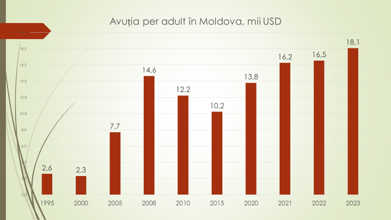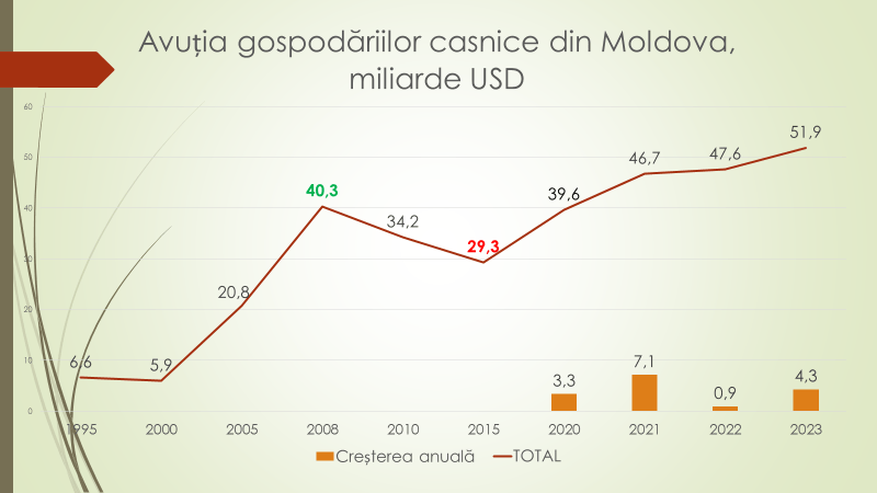 În 2023, avuția moldovenilor a depășit pragul de 50 de miliarde de dolari. Potrivit lui Veaceslav Ioniță, avuția pe care au deținut-o moldovenii în 1995 a fost de 6,6 miliarde de dolari. În 2008 s-a ridicat la 40,8 miliarde de dolari. A scăzut la 29,3 miliarde de dolari în 2015 și a crescut până la 51,9 miliarde de dolari în 2023. „Tot ce au moldovenii: locuințe, acțiuni, bani în bancă etc., este estimat la aproape 52 de miliarde de dolari, cu 4,3 miliarde de dolari mai mult față de 2022. 2021 a fost anul în care a crescut cel mai mult avuția moldovenilor, cu 7,1 miliarde de dolari”, a spus Veaceslav Ioniță.