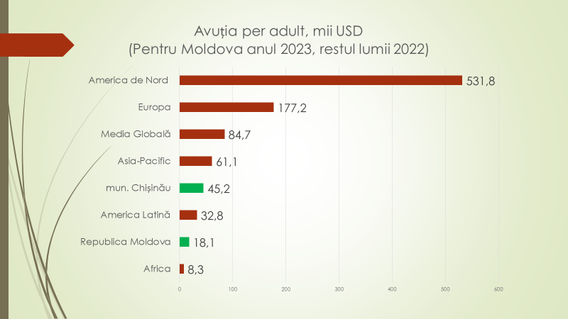 Avuția per adult în Republica Moldova a fost în 1995 de 2,6 mii de dolari. Către 2000 a scăzut la 2,3 mii de dolari. În 2008 a ajuns la 14,6 mii de dolari. A scăzut la 10,2 mii de dolari în 2015 și a crescut până la 18,1 mii de dolari în 2023, cu 1,6 mii de dolari mai mult față de 2022. Spre comparație, un adult al Americii de Nord are o avuție de 531,8 mii de dolari; din Europa – 177,2 mii de dolari; din Asia pacific – 61,1 mii de dolari; din mun. Chișinău – 45,2 mii de dolari; America latină – 32,8 mii de dolari; Republica Moldova – 18,1 mii de dolari; Africa – 8,3 mii de dolari. Media globală este de 84,7 mii de dolari.