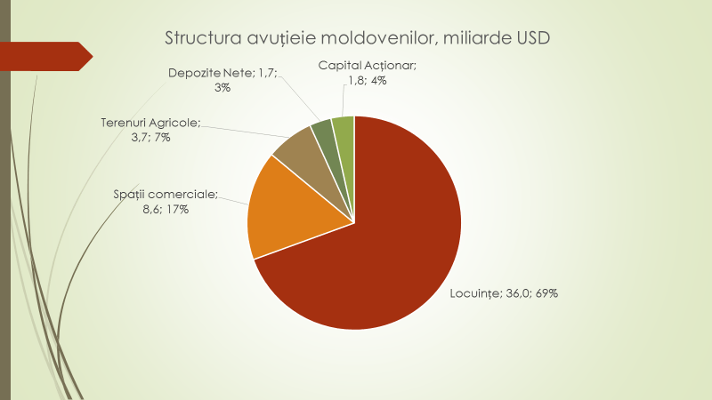 Vorbind despre structura avuției moldovenilor, expertul a declarat că: 36 de miliarde de dolari (69%) sunt în locuințe, dintre care 21,9 miliarde de dolari (60%) în municipiul Chișinău; 8,6 miliarde de dolari (17%) – spații comerciale; 3,7 miliarde de dolari (7%) – terenuri agricole; 1,8 miliarde de dolari (4%) – capital acționar; iar 1,7 miliarde de dolari (3%) – depozite nete. Referitor la valoarea de piață a locuințelor din mun. Chișinău, a declarat că în 1995 aceasta a fost de 2,3 miliarde de dolari. Către 2000 a scăzut la 1,7 miliarde de dolari. În 2005 a urcat la 8,9 miliarde de dolari. Către 2008 la 16,7 miliarde de dolari, iar în 2015 a scăzut la 11 miliarde de dolari și a urcat treptat la 21,9 miliarde de dolari în 2023.
