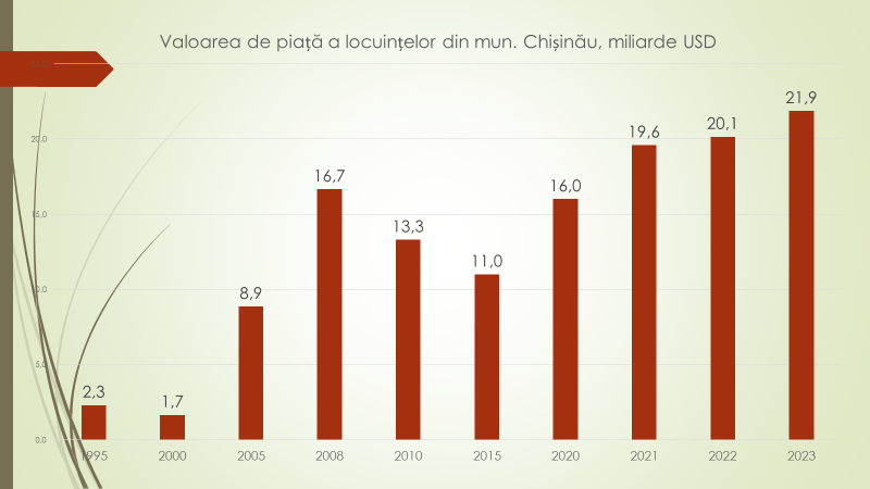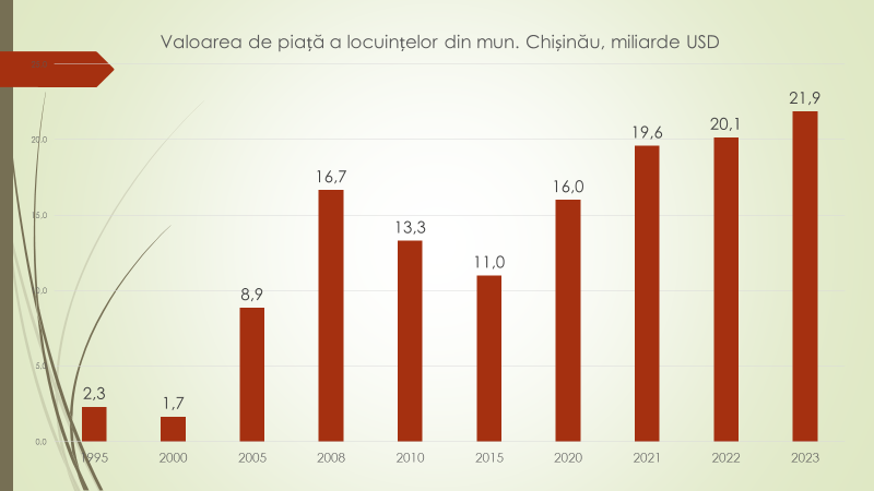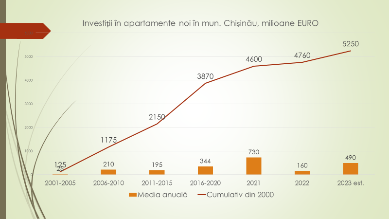 Potrivit analistului economic, în perioada 2001/2005 moldovenii au investit în apartamente noi în mun. Chișinău anual câte 25 de milioane de euro; între 2006/2010 câte 210 milioane de euro; între 2011/2015 câte 195 de milioane de euro; 2016/2020 – 344 de milioane de euro; 2021 – 730 de milioane de euro; 2022 – 160 de milioane de euro, 2023 – 490 de milioane de euro. În total din 2001 și până în 2023, moldovenii au investit 5 miliarde și 250 de milioane de euro.