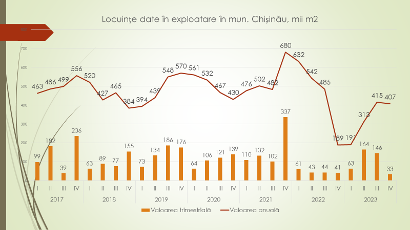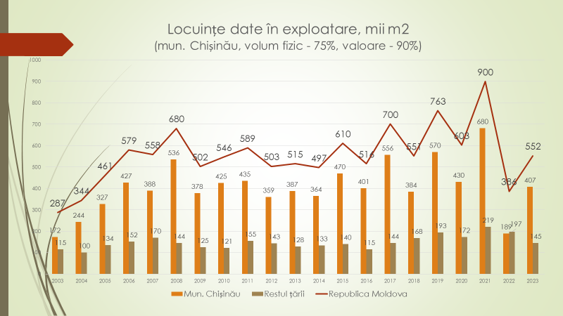 Economistul a afirmat că în 2003 s-au dat în exploatare 287 de mii de metri pătrați de spațiu locativ, dintre care 172 de mii în mun. Chișinău, iar 115 mii în restul țării. În 2008 s-au dat în exploatare 680 de mii de metri pătrați: 536 de mii în mun. Chișinău, iar 144 de mii în restul țării. În 2009 suprafața dată în exploatare a scăzut la 502 mii de metri pătrați. A crescut la 589 de mii de metri pătrați în 2011 și a scăzut din nou, la 503 mii de metri pătrați în 2012. În 2013 a crescut din nou la 515 mii de metri pătrați, iar în 2014 a scăzut tocmai la 497 de mii de metri pătrați. Fiecare an care a urmat, fie a avut creșteri, fie descreșteri. Astfel că, în 2021 s-au dat în exploatare 900 de mii de metri pătrați de spațiu locativ: 680 de mii în mun. Chișinău, iar 219 mii în restul țării. În 2022 a fost înregistrată o prăbușire de până la 386 de mii de metri pătrați: în mun. Chișinău doar 189 de mii, iar în restul țării 197 de mii. În 2023 s-au dat în exploatare 552 de mii de metri pătrați: 407 mii în mun. Chișinău, iar 145 de mii în restul țării.
