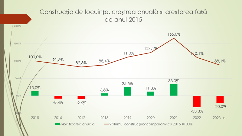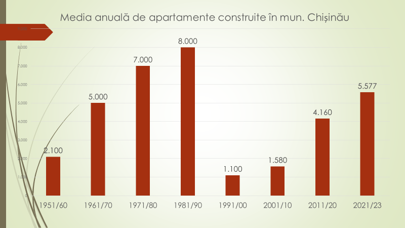 Vorbind despre construcția de locuințe din 2015 și până în prezent, dar și despre creșterea anuală și creșterea față de 2015, economistul a menționat că în 2015 a crescut cu 13% numărul locuințelor noi. În 2016 și 2017 a scăzut cu 8,4% și 9,6% față de 2015. Tot față de 2015, în 2018 a crescut numărul locuințelor cu 6,8%, în 2019 cu 25,5%, în 2020 cu 11,8%, iar în 2021 cu 33%. În 2022 și 2023 s-au înregistrat scăderi de -33,3% și de -20%. „Media anuală de apartamente construite în mun. Chișinău. În perioada 1951/1960 s-au construit 2100 de apartamente; 1961/1970 – 5000 de apartamente; 1971/1980 – 7000 de apartamente; 1981/1990 – 8000 de apartamente; 1991/2000 – 1100 de apartamente; 2001/2010 – 1580 de apartamente; 2011/2020 – 4160 de apartamente; 2021/2023 – 5577 de apartamente”, a declarat economistul.