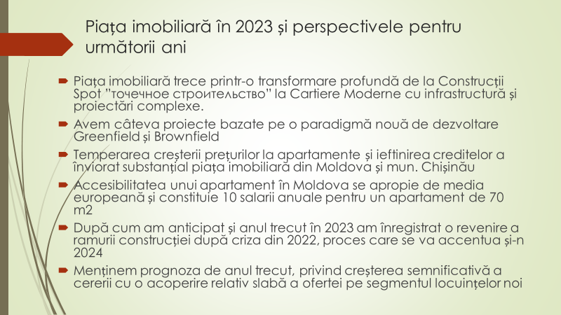 Potrivit expertului, acum, în Republica Moldova, asistăm la o transformare a pieței de construcții, care trece de la o piață sporadică, cu micro-construcții, care parazitează pe infrastructura existentă, la construcția de cartiere, care a devenit o oportunitate. „Cum a fost nu se mai dorește. Va fi un concept absolut nou. Este vorba de un câmp verde, din afara orașului, construit cu locuințe, inclusiv cu infrastructura necesară, și în felul acesta are loc extinderea armonioasă a orașului”, a spus expertul.