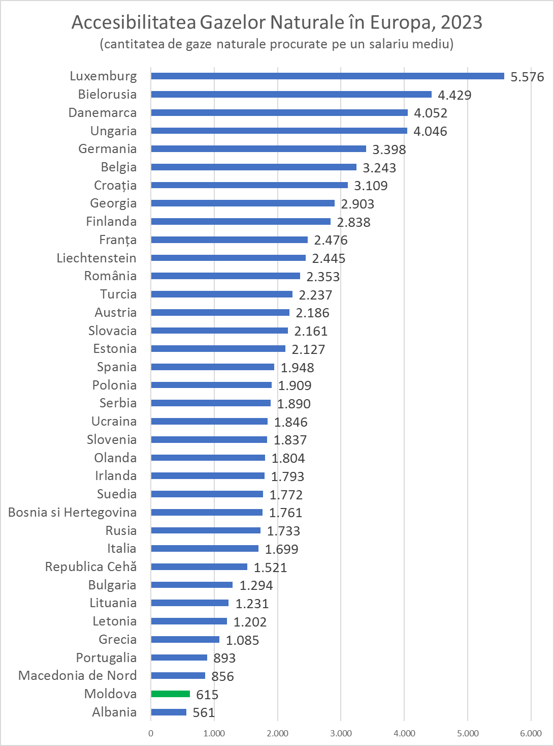 Chiar și pentru cei departe de economie, compararea tarifelor din Moldova cu cele din Elveția sunt irelevante, deoarece vorbim de putere de cumpărare absolut diferită. Pentru a înțelege care este povara reală suportată de consumatori și compararea acestei povere între țări, trebuie să raportăm prețul la gazele naturale la salariul din fiecare țară analizată. Noi numim acest indicator: Accesibilitatea gazului natural. Mai simplu spus, câți m3 de gaze naturale poate procura un consumator pe un salariu mediu din țara sa.