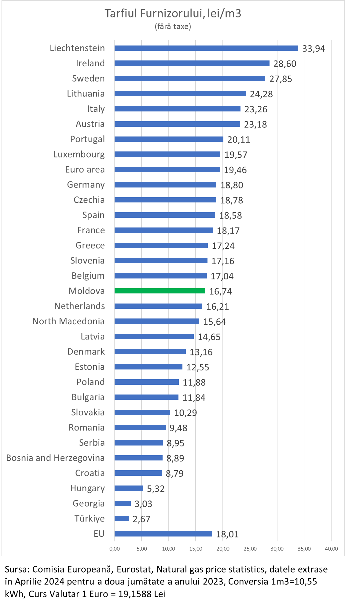 Media în Țările UE a fost de 22,74 lei/m3.