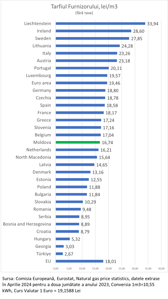 Observăm că aici situația Moldovei este mult mai proastă decât în primul grafic. Tarfiul furnizorului din Moldova a fost unul mult mai prost decât media regională. Acest lucru se explică prin faptul că în 2023, Furnizorul național nu a avut dreptul să procure gaze naturale direct de pe piață, dar a fost obligat să procure de la un intermediar cu un preț de 50-60% mai mare decât prețul obișnuit de achiziție. Acest adaos a intrat în tarife și a fost suportat de consumatori.