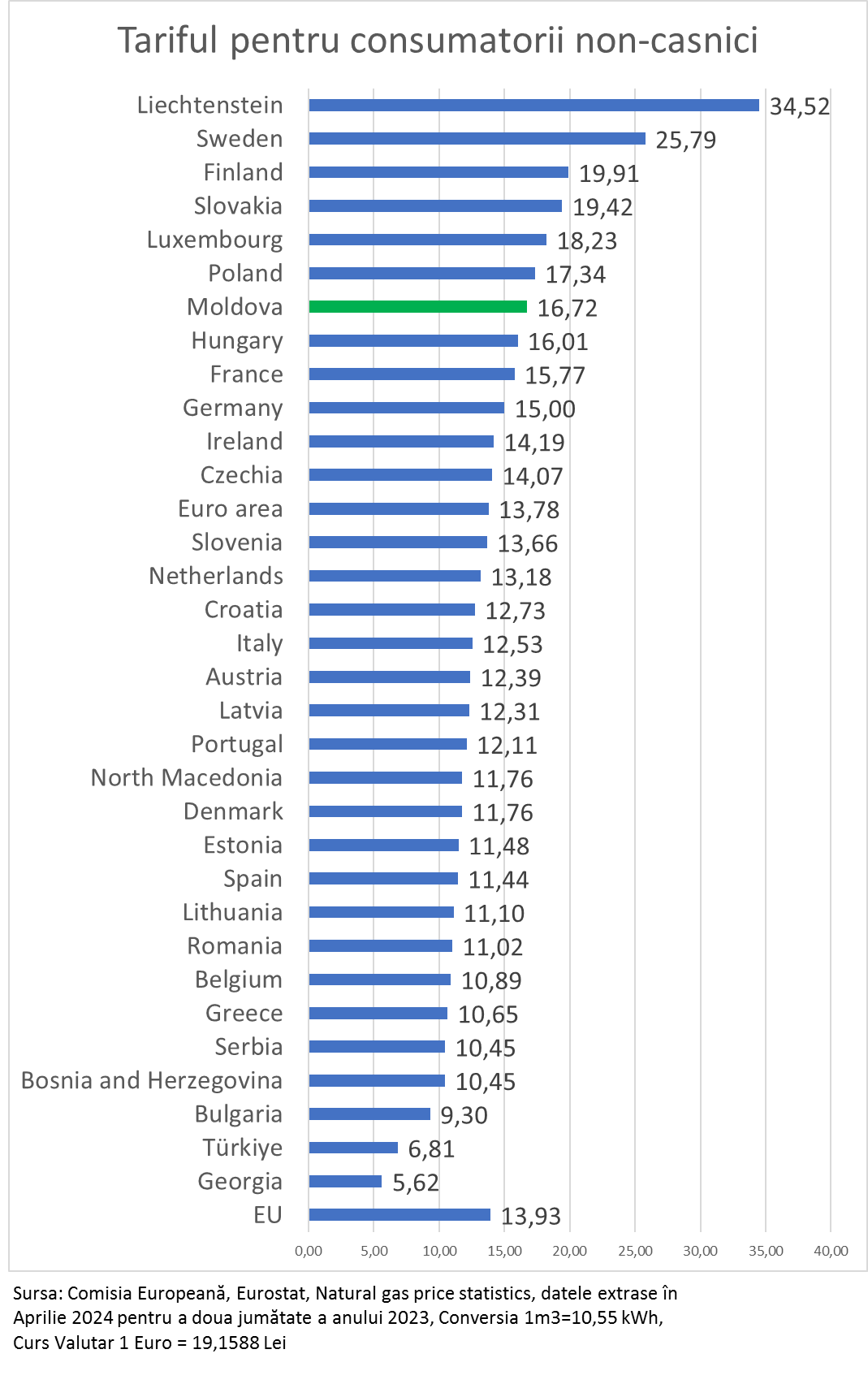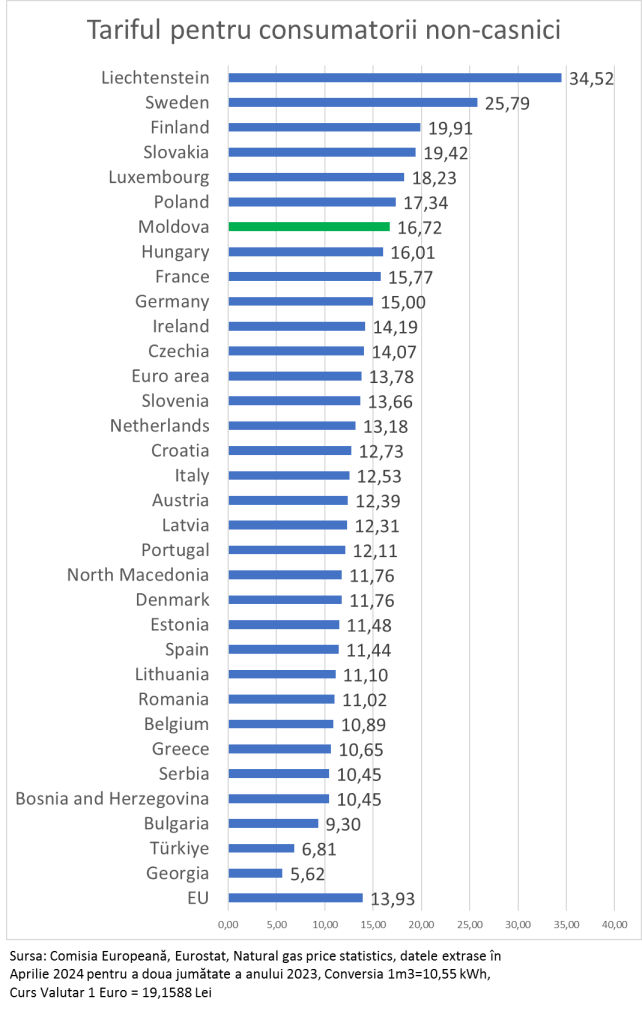 Însă adevărata dramă în 2023 au trăit-o consumatorii non-casnici din Moldova, mai simplu spus agenții economici. Ei au avut parte de unul din cele mai mari tarife din Europa. Aceasta se datorează monopolului de pe piață, lipsei unei concurențe reale, ingerinței statului și menținerii prin instrumente administrative a monopolului. Ultimul grafic de fapt denotă starea reală a lucrurilor din domneniul gazelor naturale și dramei mediul de afaceri din Moldova.