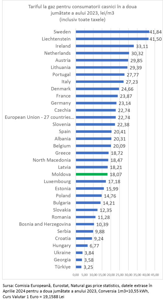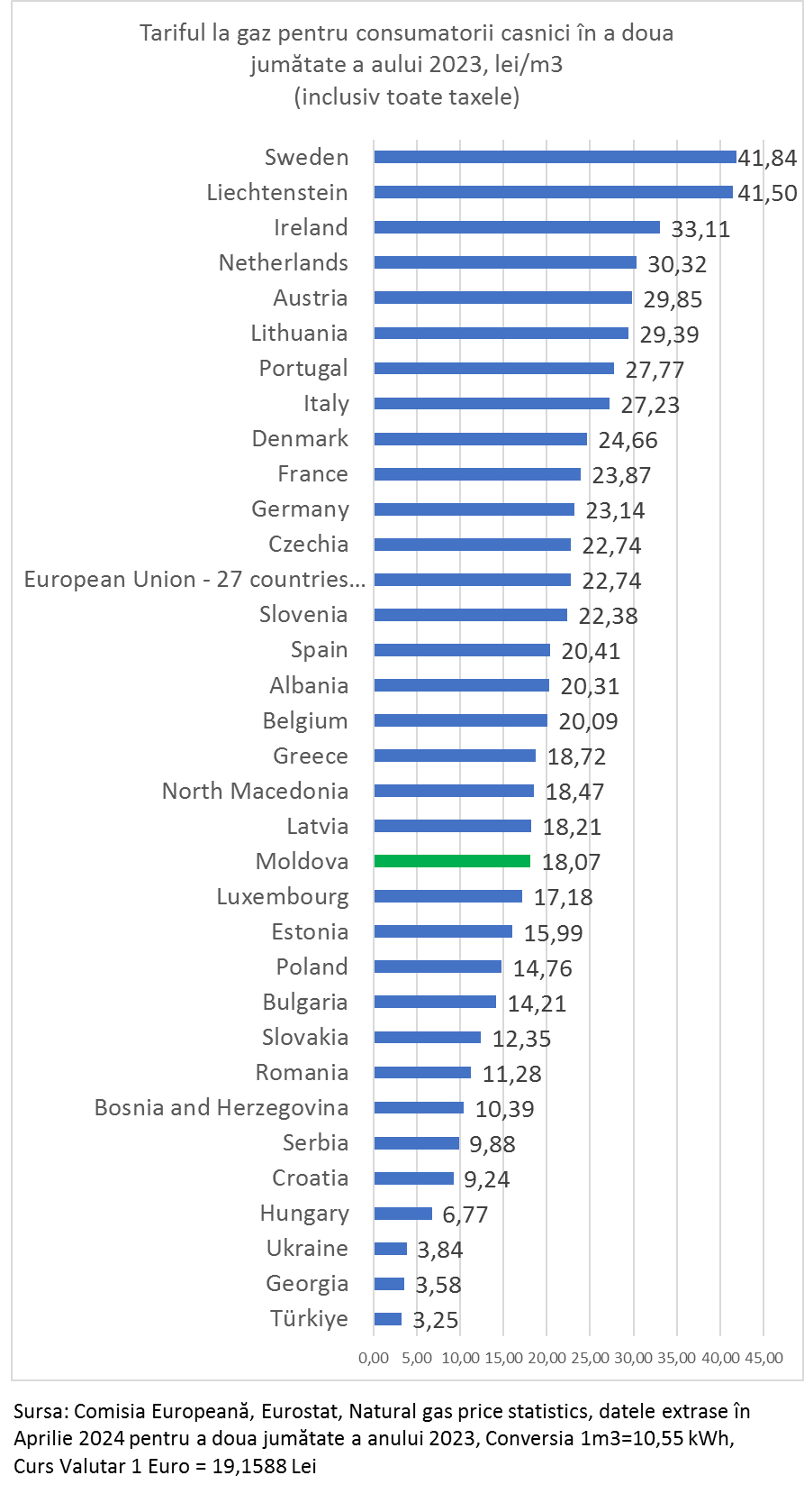 Recent Eurostat al Comisiei Europene a publicat tarifele la gazele naturale achitate de consumatorii casnici pentru a doua jumătate a anului 2023 (vedeți aici).