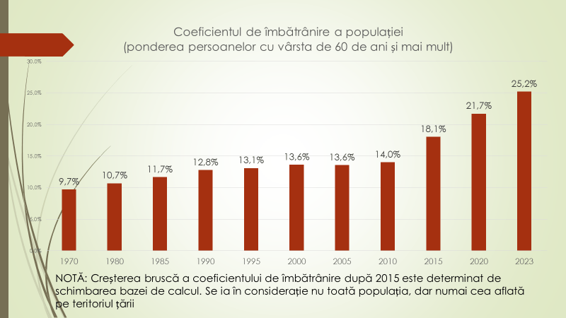 Coeficientul de îmbătrânire al populației. Economistul susține că în 1970, ponderea persoanelor cu vârsta de 60 de ani și mai mult era de 9,7%; 1980 – de 10,7%; 1990 – 12,8%; 2000 – 13,6; 2010 – 14%; 2015 – 18,1%; 2020 – 21,7%; 2023 – 25,2%. Astfel, fiecare a patra persoană are peste 60 de ani.