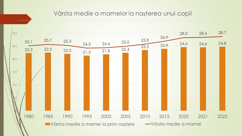 Vârsta medie a mamelor la nașterea unui copil. În 1980, vârsta medie a unei mame era de 25,1 ani, iar a unei mame la prima naștere – 22,3 ani. În 1990, vârsta medie a unei mame – 25,3 ani, iar la prima naștere – 22 de ani. În 2000, vârsta medie a unei mame – 24,4 ani, iar la prima naștere – 21,8 ani. În 2010, vârsta medie a unei mame – 25,8 ani, iar la prima naștere – 23,5 ani. În 2020, vârsta medie a unei mame – 28,3 ani, iar la prima naștere – 24,6 ani. În 2022, vârsta medie a unei mame – 28,7 ani, în creștere cu 5 ani față de 1995, iar la prima naștere – 24,8 ani, în creștere cu 4 ani față de acum 30 de ani.
