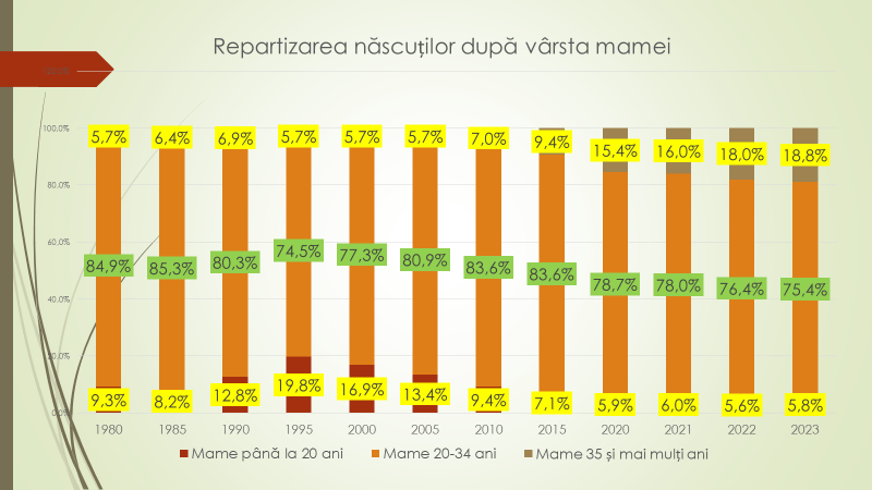 Repartizarea născuților după vârsta mamei. În 1980: 84,9% dintre mame aveau între 20 și 34 de ani, 9,3% – până la 20 de ani, iar 5,7% – 35 și mai mulți ani. În 2000: 77,3% dintre mame aveau între 20 și 34 de ani, 16,9% – până la 20 de ani, iar 5,7% – 35 și mai mulți ani. În 2010: 83,6% aveau între 20 și 34 de ani, 5,9% – până la 20 de ani, iar 15,4% – 35 și mai mulți ani. În 2023: 75,4% – 20 și 34 de ani, 5,8% – până la 20 de ani, iar 18,8% – 35 și mai mulți ani. „În special după 2010, se înregistrează o creștere constantă a vârstei mamelor care au mai mult de 35 de ani”, constată expertul.