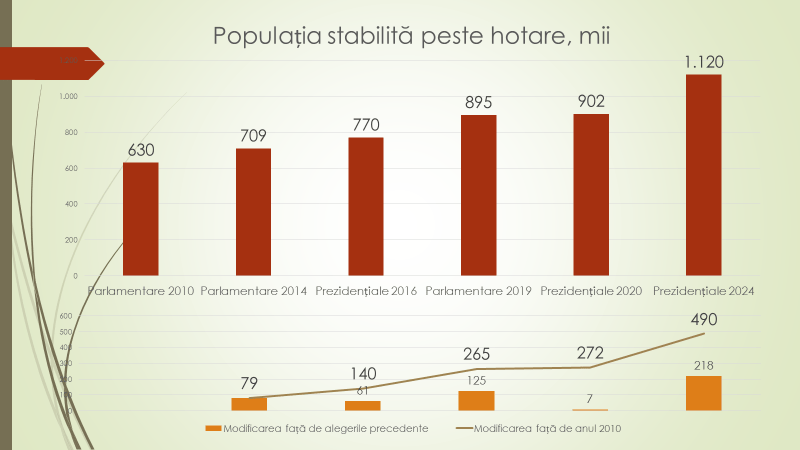 Populația stabilită peste hotare. Economistul susține că la alegerile parlamentare din 2010 erau 630 de mii de moldoveni peste hotare; la alegerile parlamentare din 2014 – 709 mii; la alegerile prezidențiale din 2016 – 770 de mii; la alegerile parlamentare din 2019 – 895 de mii, la alegerile prezidențiale din 2020 – 902 mii; iar la alegerile prezidențiale din 2024 vor fi circa 1 milion 120 de mii de moldoveni. Astfel, timp de 4 ani, numărul celor plecați peste hotare a crescut cu 218 mii. Iar din 2010 și până în prezent, numărul celor plecați peste hotare a crescut cu 490 de mii.