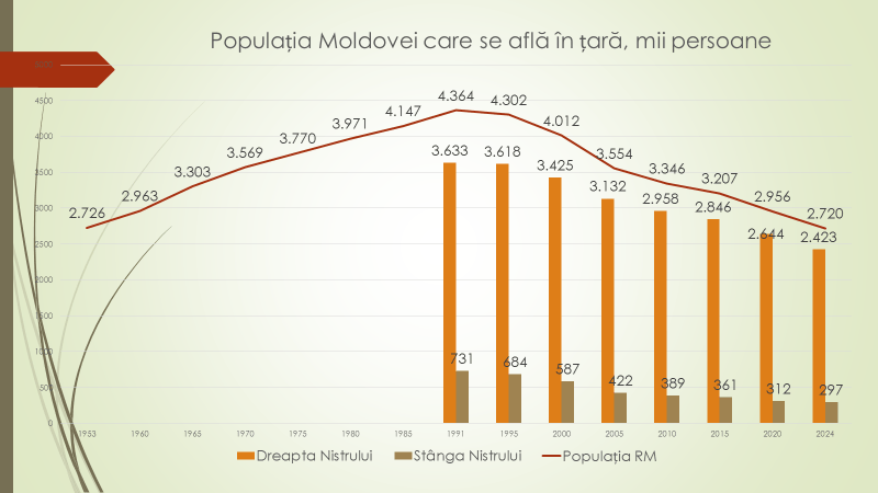 Populația Republicii Moldova aflată în țară. Potrivit expertului, în 1953 în țară erau 2,7 mln de locuitori; în 1960 – 2,9 mln; 1970 – 3,5 mln; 1980 – 3,9 mln; 1991 – 4,3 mln, dintre care 3,6 mln în dreapta Nistrului, iar 731 de mii-malul stâng; 2000 – puțin peste 4 mln: 3,4 mln-dreapta Nistrului, iar 587 de mii-malul stâng; 2010 – 3,3 mln: 2,9 mln-malul drept, iar 380 de mii-cel stâng; 2020 – 2,9 mln: 2,6 mln-malul drept, iar 312 mii-malul stâng; 2024 – 2,7 mln: 2,4-malul drept, iar 297 de mii-malul stâng. „Populația Republicii Moldova a ajuns la nivelul anului 1953, s-a dus cu 70 de ani în urmă”, a spus expertul.