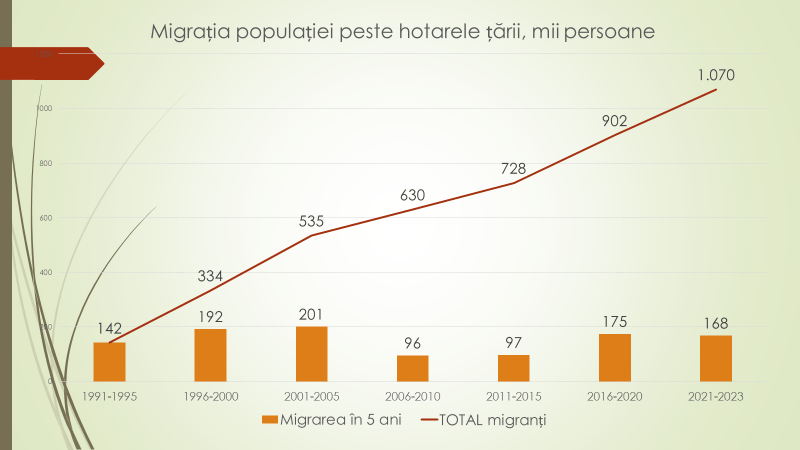 Emigrația populației din Republica Moldova (media anuală). Economistul afirmă că în perioada 2001/2005 – a emigrat 1,53% din populația Republicii Moldova; între 2006/2010 – 0,83%; 2011/2015 – 0,72%; 2016/2020 – 1,45%; 2021-2023 – 2,65%. „În ultimii trei ani s-a înregistrat cel mai înalt ritm de migrație din istoria Republicii Moldova. În prezent, viteza de emigrație este de două ori mai mare decât în oricare altă perioadă din istoria Republicii Moldova”, a afirmat economistul.