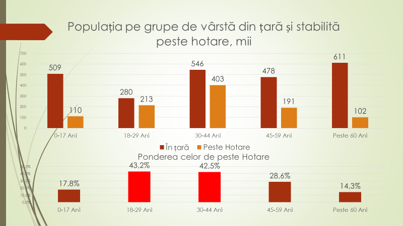 Populația pe grupe de vârstă din țară și stabilită peste hotare. Potrivit economistului, până la 17 ani, în țară sunt 509 mii de persoane, iar peste hotare – 110 mii sau 17,8%. Cu vârsta de 18-29 de ani, în țară sunt 280 de mii, iar peste hotare – 213 mii sau 43,2%. 30-44 de ani: în țară – 546 de mii, peste hotare – 403 mii sau 42,5%; 45-59 de ani: în țară – 478 de mii, peste hotare – 191 de mii sau 28,6%; peste 60 de ani: în țară – 611 mii, peste hotare – 102 mii sau 14,3%). „Avem o migrație sporită a celor tineri. În următorii ani, numărul lor va fi mai mare peste hotare, decât în țară. Cel mai mare grup care se află în țară, sunt persoanele de peste 60 de ani”, potrivit economistului.