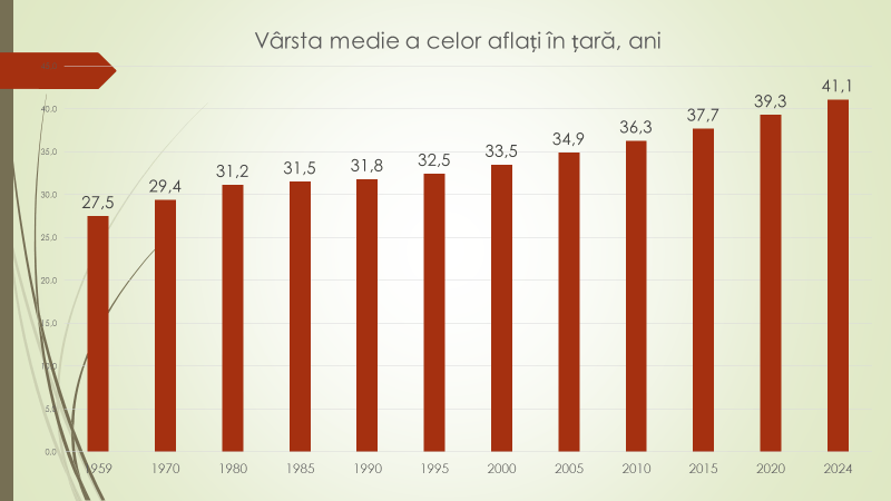 Vârsta medie a celor aflați în țară. Analistul economic menționează că în 1959, vârsta medie a celor din țară era de 27,5 ani; în 1970 – 29,4 ani; 1980 – 31,2 ani; 1990 – 31,8 ani; 2000 – 33,5 ani; 2010 – 36,3 ani, 2020 – 39,3 ani; 2024 – 41,1 ani. „În ultimii patru ani, vârsta medie a populației aflată în țară a îmbătrânit cu patru ani. Acest lucru va fi o presiune enormă pe sistemul de pensionare moldovenesc. Practic nu avem tineri, avem doar populație în vârstă. Tinerii au migrat spre țările dezvoltate, care au, la fel, o îmbătrânire a populației, dar la ei au plecat tinerii noștri și nu există această presiune socială. În Republica Moldova, tinerii pleacă, numărul celor vârstnici crește, iar forța de muncă este slabă. Riscăm să intrăm într-un colaps și nu vom reuși să facem față provocărilor”, a menționat analistul economic.