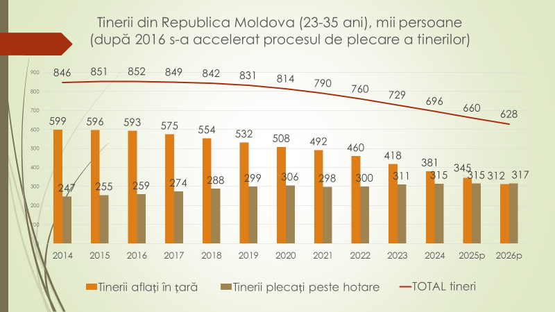 Tinerii din Republica Moldova de la 23 la 35 de ani. În 2014, afirmă expertul, Republica Moldova avea 846 de mii de tineri de la 23 la 35 de ani, dintre care 599 de mii în țară, iar 247 de mii – peste hotare. În 2016 – 852 de mii: 593 de mii-în țară, iar 259 de mii-peste hotare; 2018 – 842 de mii: 554 de mii-în țară, iar 288 de mii-peste hotare; 2020 – 814 mii: 508 mii-în țară, 306 mii-peste hotare; 2022 – 760 de mii: 460 de mii-în țară, iar 300 de mii-peste hotare; 2024 – 696 de mii: 381 de mii-în țară; 315 mii-peste hotare; 2026, estimativ – 628 de mii: 312 mii-în țară, 317 mii-peste hotare. „În ultimii patru ani, numărul tinerilor moldoveni a scăzut cu 130 de mii în interiorul țării și a crescut cu 10 mii în exterior. În 2026, numărul tinerilor plecați va fi mai mare decât al celor aflați în țară. Primul factor este migrația masivă, iar al doilea, este natalitatea în scădere avansată”, a afirmat expertul.