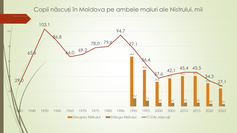 Copii născuți în Republica Moldova. Potrivit datelor analizate, în 1845 erau 29 de mii de copii; în 1940 – 65600; 1950 – 103100; 1960 – 86800; 1965 – 66000; 1970 – 69200; 1980 – 79600; 1986 – 94700; 1990 – 77100, dintre care: 66400 pe malul drept al Nistrului, iar 10700-în regiunea separatistă transnistreană; 2000 – 37600: 32600-dreapta Nistrului; 5000-stânga Nistrului; 2015 – 45500: 40500-malul drept, 5000-malul stâng; 2023 – 27100: 24000-dreapta Nistrului, 3100-stânga Nistrului. „Ultima dată, atât de puține nașteri a fost în 1844, cu 180 de ani în urmă”, susține analistul.