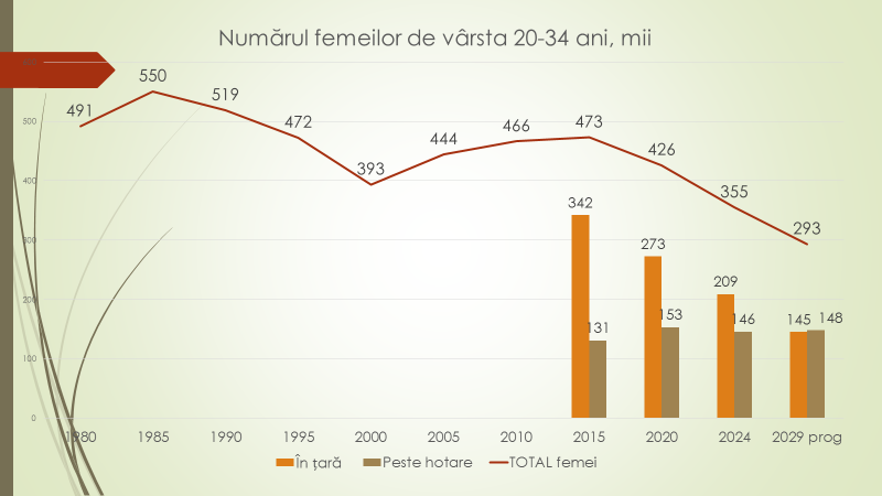 Numărul femeilor de vârsta 20-34 ani. În 1980, potrivit lui Veaceslav Ioniță, erau 491 de mii de femei; 1985 – 550 de mii; 1990 – 519 mii; 2000 – 393 de mii; 2010 – 466 de mii; 2015 – 473 de mii, dintre care 343 de mii erau în țară, iar 131 de mii-peste hotare; 2020 – 426 de mii: 273 de mii-în țară, iar 153 de mii-peste hotare. 2024 – 355 de mii: 209 mii-în țară, iar 146 de mii-peste hotare; 2029, estimativ, vor fi 293 de mii, dintre care 145 de mii vor fi în țară, iar 148 de mii-peste hotare. „După 2029 mai mulți moldoveni se vor naște peste hotare, decât în interiorul țării”, potrivit lui Veaceslav Ioniță.