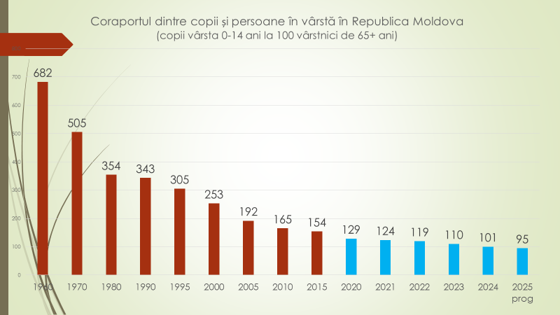 Coraportul dintre copii și persoane în vârstă în Republica Moldova. Analistul economic menționează că în 1960 erau 682 de copii de 0-14 ani la 100 vârstnici de 65+ ani; 1970 – 505 copii de 0-14 ani la 100 vârstnici de 65+ ani; 1980 – 354 de copii de 0-14 ani la 100 vârstnici de 65+ ani; 1990 – 343 de copii de 0-14 ani la 100 vârstnici de 65+ ani; 2000 – 253 de copii de 0-14 ani la 100 vârstnici de 65+ ani; 2010 – 165 de copii de 0-14 ani la 100 vârstnici de 65+ ani; 2020 – 129 de copii de 0-14 ani la 100 vârstnici de 65+ ani; 2024 – 101 copii de 0-14 ani la 100 vârstnici de 65+ ani; în 2025, estimativ vor fi 95 de copii de 0-14 ani la 100 vârstnici de 65+ ani. „Anul viitor, numărul copiilor va fi mai mic decât numărul bătrânilor. În viitorii zece ani, situația demografică se va înrăutăți și mai mult. Presiunea socială, presiunea demografică în Republica Moldova este una gravă, dar în prezent este una bună față de ceea ce urmează să fie în următorii zece ani”, crede analistul economic.
