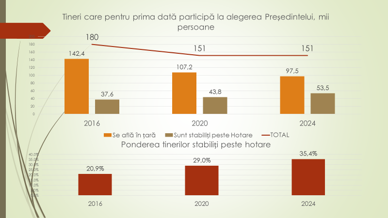 Tineri care pentru prima dată participă la alegerea președintelui/președintei. În 2016 erau 180 de mii de tineri, dintre care 142,4 mii se aflau în țară, iar 37,6 mii-peste hotare. În 2020 – 151 de mii de tineri: 107,2 mii-în țară, iar 43,8-peste hotare. 2024 – 151 de mii: 97,5 mii-în țară, 53,5-peste hotare.