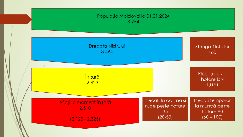 Populația Republicii Moldova aflată în țară. Potrivit expertului, în 1953 în țară erau 2,7 mln de locuitori; în 1960 – 2,9 mln; 1970 – 3,5 mln; 1980 – 3,9 mln; 1991 – 4,3 mln, dintre care 3,6 mln în dreapta Nistrului, iar 731 de mii-malul stâng; 2000 – puțin peste 4 mln: 3,4 mln-dreapta Nistrului, iar 587 de mii-malul stâng; 2010 – 3,3 mln: 2,9 mln-malul drept, iar 380 de mii-cel stâng; 2020 – 2,9 mln: 2,6 mln-malul drept, iar 312 mii-malul stâng; 2024 – 2,7 mln: 2,4-malul drept, iar 297 de mii-malul stâng. „Populația Republicii Moldova a ajuns la nivelul anului 1953, s-a dus cu 70 de ani în urmă”, a spus expertul.
