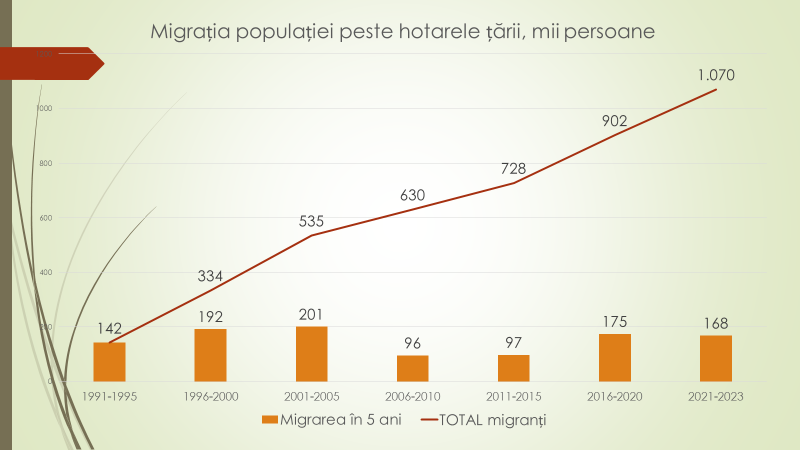 Migrația populației peste hotare. Veaceslav Ioniță declară că în perioada 1991/1995 au migrat 142 de mii de moldoveni; între 1996/2000 – au plecat alții 192 de mii, iar numărul celor plecați a atins cifra de 334 de mii. Între 2001/2005 au plecat alții 201 mii, iar numărul celor plecați a ajuns la 535 de mii. Între 2006/2010 au mai plecat 96 de mii de moldoveni, iar numărul celor plecați era de 630 de mii. Între 2011/2015 – au plecat alții 97 de mii, iar numărul lor a ajuns la 728 de mii. Între 2016/2020 – 175 de mii s-au dus, iar numărul lor a ajuns la 902 mii. Între 2021/2023 – 168 de mii s-au dus, atingând cifra de 1 milion 70 de mii de oameni, plus circa 100 de mii care vin și pleacă de câteva ori pe parcursul unui an.