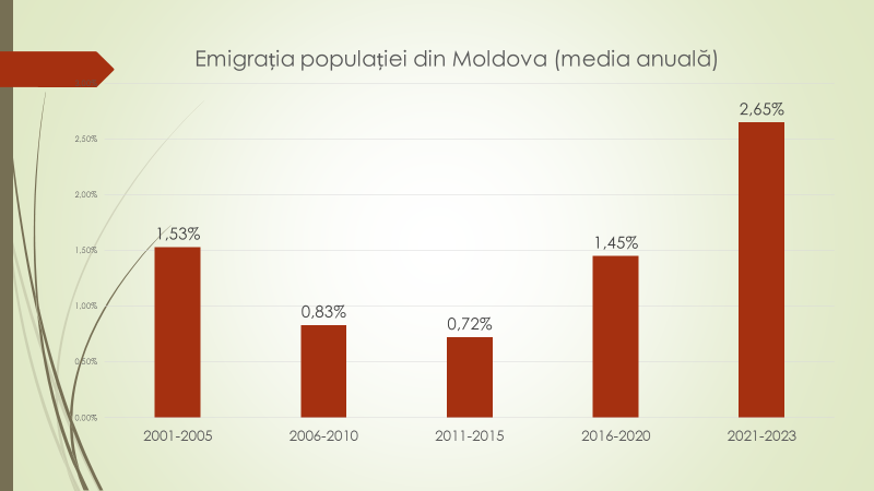 Emigrația populației din Republica Moldova (media anuală). Economistul afirmă că în perioada 2001/2005 – a emigrat 1,53% din populația Republicii Moldova; între 2006/2010 – 0,83%; 2011/2015 – 0,72%; 2016/2020 – 1,45%; 2021-2023 – 2,65%. „În ultimii trei ani s-a înregistrat cel mai înalt ritm de migrație din istoria Republicii Moldova. În prezent, viteza de emigrație este de două ori mai mare decât în oricare altă perioadă din istoria Republicii Moldova”, a afirmat economistul.