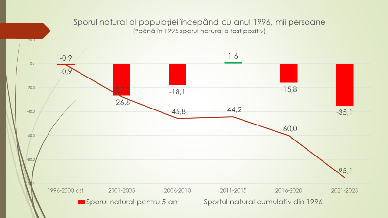 Sporul natural al populației. Veaceslav Ioniță a declarat că între 1996/2000 s-au născut cu 9 mii de copii mai puțin decât numărul persoanelor decedate; între 2001/2005 – s-au înregistrat cu 26800 nașteri mai puține decât decese; 2006/2010 –cu 18100 de nașteri mai puține decât decese; 2011/2015 – au fost cu 1600 de nașteri mai multe față de numărul deceselor; 2016/2020 – s-au născut cu 15800 de copiii mai puțini decât decesele înregistrate; 2021/2023 – au fost cu 35100 de nașteri mai puține față de numărul deceselor. „Timp de 25 de ani, s-au născut cu 95100 de persoane mai puține decât au murit. Până în 1995 se nășteau mai mulți decât mureau. După 1996, în toată perioadele analizate, natalitatea a fost negativă, cu excepția anilor 2011/2015. În ultimii trei ani a fost înregistrat cel mai negativ spor natural din istoria Republicii Moldova. Practic avem o natalitate la pământ”, a declarat Veaceslav Ioniță.