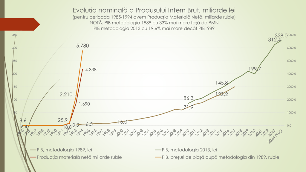 Despre evoluția nominală a Produsului Intern Brut (PIB), Veaceslav Ioniță a spus că în 1985 acesta a constituit 8,6 miliarde (mlrd) de ruble. În 1991 – 25,9 mlrd/ruble; 1993, când a fost aprobat leul moldovenesc – 2,2 mlrd/lei; 1995 – 6,5 mlrd/lei; 2000 – 16 mlrd/lei; 2010 – 86,3 mlrd/lei; 2015 – 145,8 mlrd/lei; 2020 – 199,7 mlrd/lei; 2024, prognozat – 342,1 mlrd/lei. „Din 1993 și până în prezent avem o creștere nominală a PIB-ului de peste 150 de ori”, a spus Veaceslav Ioniță.