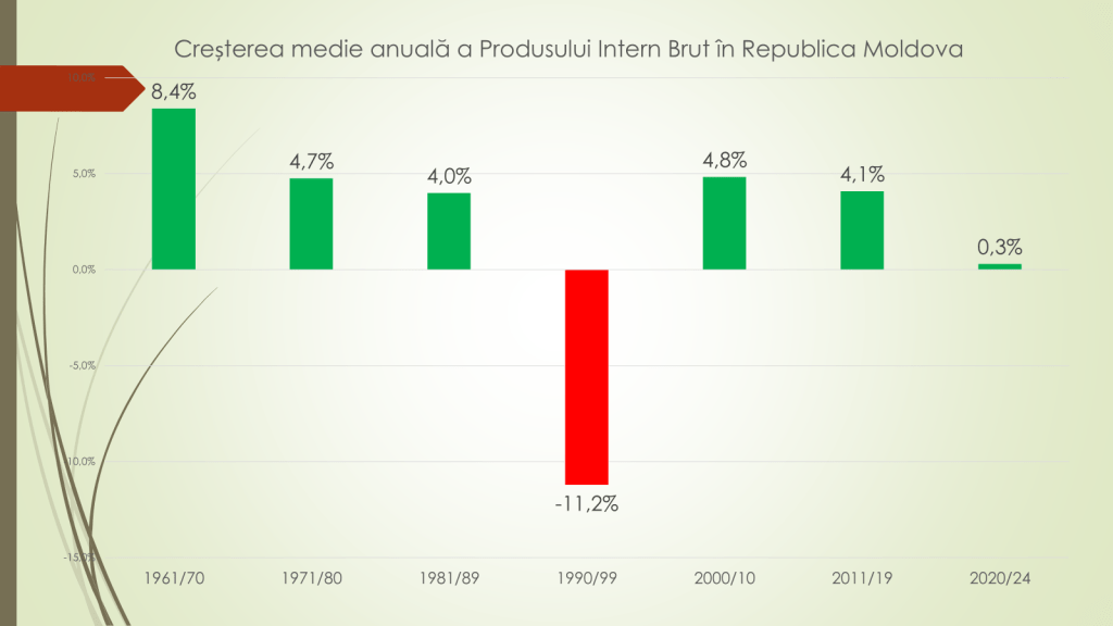Analizând media anuală a PIB-ului, expertul susține că între 1961-1970 acesta a crescut cu 8,4%; între 1971-1980 – cu 4,7%; 1981-1989 – 4%; 1990-1999 – minus 11,2%; 2000-2010 – 4,8%; 2011-2019 – 4,1%; 2020-2023 – 0,3%. „În ultimii cinci ani Republica Moldova a stat pe loc”, spune expertul.