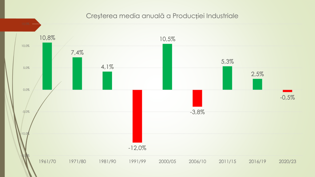 Privind media anuală a producției industriale, expertul a mai declarat că între 1961-1970 aceasta a crescut cu 10.8%; între 1971-1980 – cu 7,4%; 1981-199 – 4,1%; 1991-1999 – minus 12%; 2000-2005 – 10,5%; 2006/2020 – minus 3,8%; 2011/2015 – 5,3%; 2016/2019 – 2,5%; 2020/2023 – minus 0,5%. „Industria Republicii Moldova are nevoie de mulți ani să ajungă unde a fost”, a mai declarat expetul.