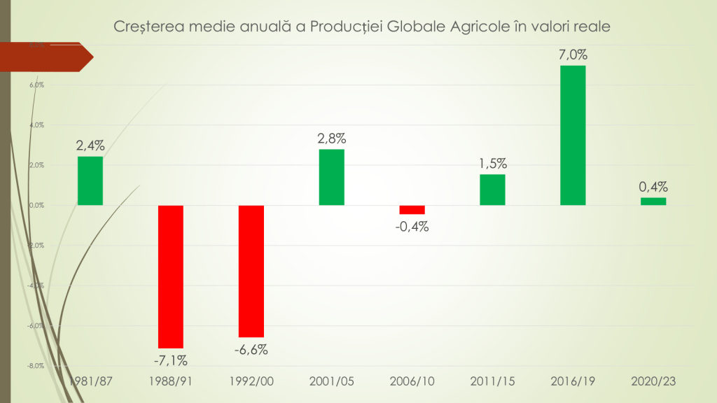 Vorbind despre media anuală a producției globale agricole în valori reale, economistul a mai afirmat că între 1981 și 1987 a crescut cu 2,4%; între 1988-1991 – a scăzut cu 7,1%; 1992-2000 – +6,6%; 2001-2005 – +2,8%; 2006-2010 – minus 0,4%; 2011-2015 – +1,5%; 2016-2019 – +7%; 2020-2023 – +0,4%. „Creșterea spectaculoasă din 2021 a fost anihilată complet de evoluția extrem de proastă din 2020, 2022 și 2023”, a mai afirmat economistul.