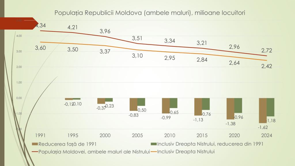 Descriind populația Republicii Moldova, analistul economic a menționat că în 1991 aceasta era de 4,34 de milioane de locuitori (mln/locuitori), dintre care 3,60 mln pe malul drept al râului Nistru. În 2000: 3,96 mln/locuitori, dintre care 3,37 mln pe malul drept. Cu 37 de mii mai puțini față de 1991, inclusiv minus 23 de mii în dreapta Nistrului. În 2010: 3,34 mln/locuitori în țară, dintre care 2,95 mln pe malul drept. Cu 99 de mii mai puțini în țară față de 1991, inclusiv cu 65 de mii mai puțini în dreapta Nistrului. În 2024: 2,72 mln/locuitori în țară, dintre care 2,42 mln pe malul drept al Nistrului. Cu 1,6 mln mai puțini în țară față de 1991, dintre care 1,18 mln a fost reducerea pe malul drept. „Populația Republicii Moldova, de pe ambele maluri ale Nistrului, a scăzut dramatic. Din nefericire suntem țara cu cea mai mare prăbușire a numărului populației din toată Europa”, a menționat analistul economic.