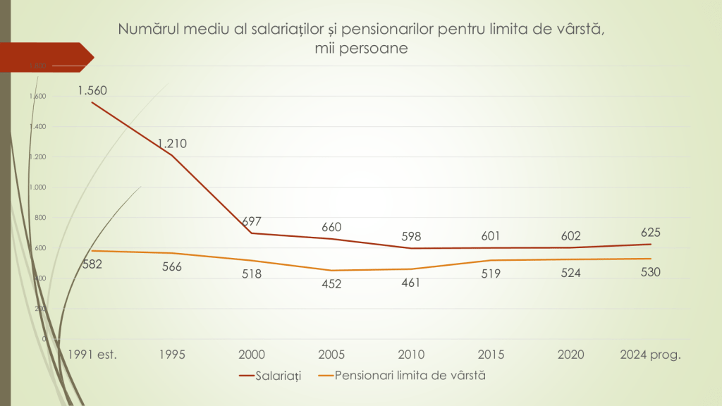Potrivit expertului, în 1991, în Republica Moldova erau 1,5 milioane de salariați și 582 de mii de pensionari; în 1995 a scăzut la 1,2 milioane de salariați și la 566 de mii de pensionari. În 2000 s-a ajuns la 697 de mii de salariați și la 518 mii de salariați. În 2005 erau 660 de mii de salariați și 452 de mii de pensionari; 2010 – 598 de mii de salariați și 461 de mii de pensionari: 2015 – 601 mii de salariați și 519 mii de pensionari; 2020 – 602 mii de salariați și 524 de mii de pensionari; 2024, prognozat – 625 de mii de salariați și 530 de mii de pensionari. „Avem o scădere de 900 de mii de locuri de muncă, pe care nu le-a recuperat până astăzi. 600 de mii de locuri de muncă avem în ultimii 15 ani. Nu am găsit soluții pentru creștere economică și a angaja oamenii în câmpul muncii”, a spus expertul.