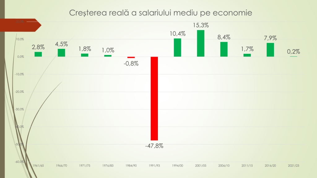 Despre salariul mediu pe economie, economistul a specificat că între 1961/1965 acesta a crescut cu 2,8% anual; 1966/1970 – +4,5%; 1971/1975 – +1,8%; 1976/1983 – +1%; 1984/1990 – minus 0,8%; 1991/1993 – minus 47,8% anual; 1994/2000 – +10,4%; 2001/2005 – +15,3%; 2006-2010 – +8,4%; 2011/2015 – +1,7%; 2016/2020 – +7,9%; 2021/2023 – +0,2%.