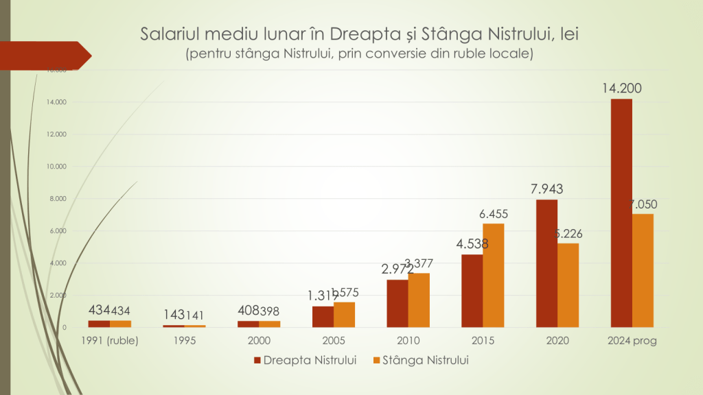 Potrivit analistului economic, în 1991 pe ambele maluri ale râului Nistru salariile medii lunare erau de 434 de ruble. În 1995: 143 de lei pe malul drept și 141 de lei pentru malul stâng. În 2000: 408 lei pentru malul drept și 398 de lei-malul stâng; 2005: 1319 lei-malul drept, 1575 de lei-malul stâng; 2010: 2972 lei-malul drept, 3377 de lei-malul stâng; 2015: 4538 de lei-malul drept, 6455 de lei-malul stâng; 2020: 7943 de lei-malul drept, 5226 de lei-malul stâng; 2024, estimativ: 14200 lei-malul drept, 7050 lei-malul stâng. „În prezent în dreapta Nistrului, salariul este de două ori mai mare decât pe malul stâng. Să vii din regiunea separatistă transnistreană să lucrezi la Chișinău este ceva similar cu situația moldovenilor care pleacă peste hotare la muncă”, a declarat analistul economic.