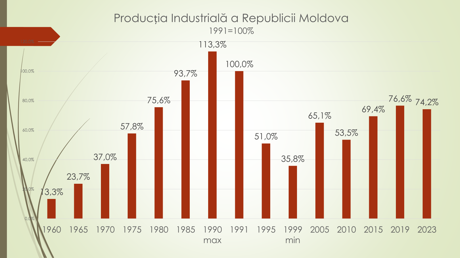 Privind media anuală a producției industriale, expertul a mai declarat că între 1961-1970 aceasta a crescut cu 10.8%; între 1971-1980 – cu 7,4%; 1981-199 – 4,1%; 1991-1999 – minus 12%; 2000-2005 – 10,5%; 2006/2020 – minus 3,8%; 2011/2015 – 5,3%; 2016/2019 – 2,5%; 2020/2023 – minus 0,5%. „Industria Republicii Moldova are nevoie de mulți ani să ajungă unde a fost”, a mai declarat expetul.