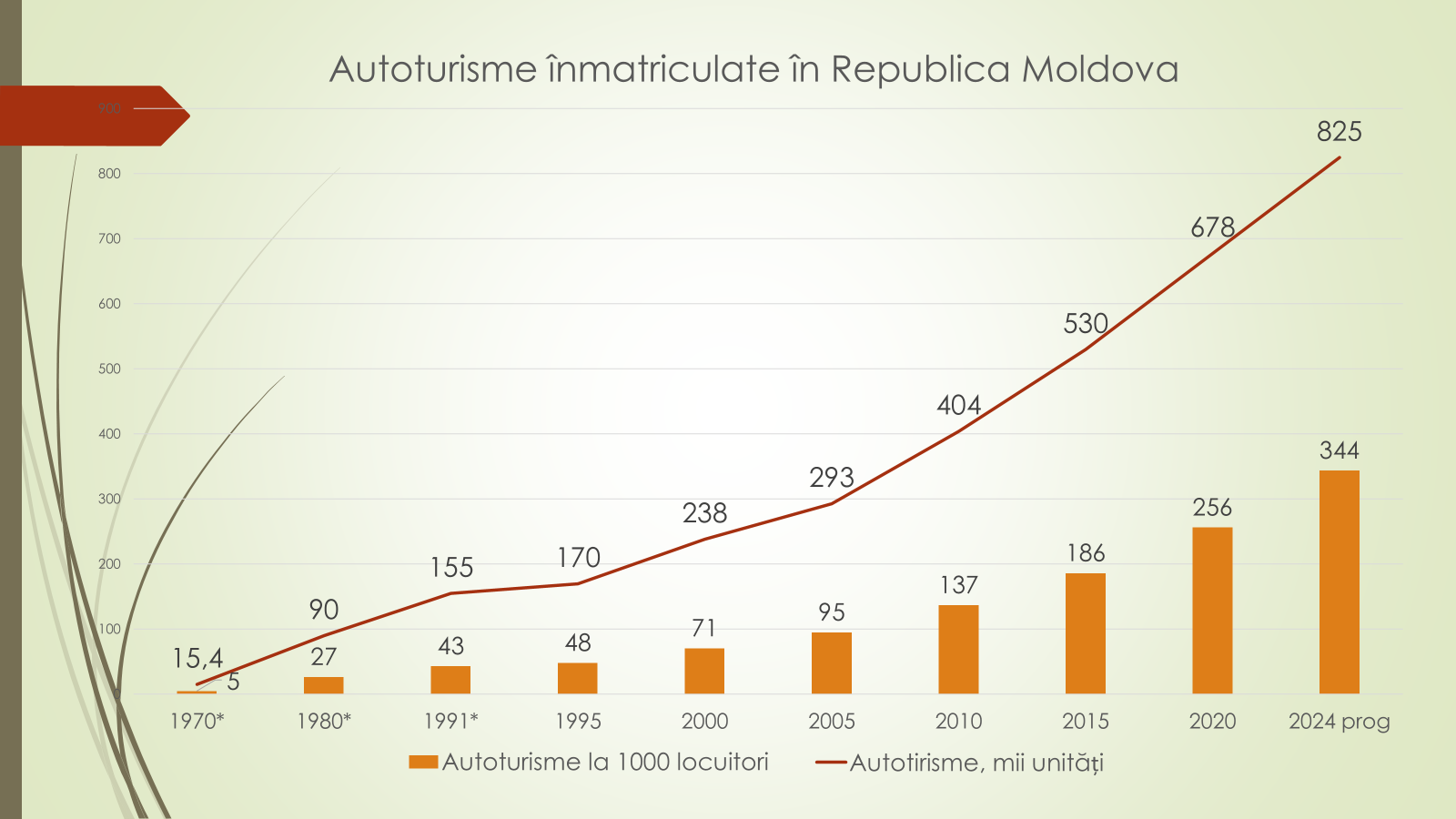 Cu referire la autoturisme înmatriculate în Republica Moldova, economistul a specificat faptul că în 1970 erau 15,4 mii de unități sau 5 autoturisme la 1000 de locuitori. În 1980 – 90 de mii de unități sau 27 de autoturisme la 1000 de locuitori; 1991 – 155 de mii de unități sau 43 de autoturisme la 1000 de locuitori; 2000 – 238 de mii de unități sau 71 de autoturisme la 1000 de locuitori; 2010 – 404 mii de unități sau 137 de autoturisme la 1000 de locuitori; 2020 – 678 de mii de unități sau 256 de autoturisme la 1000 de locuitori; 2024, estimativ – 825 de mii de unități sau 344 de autoturisme la 1000 de locuitori.